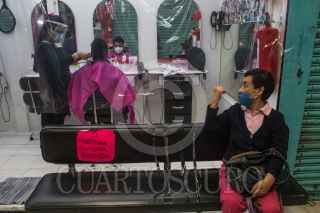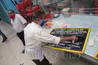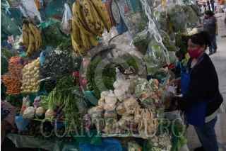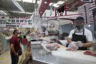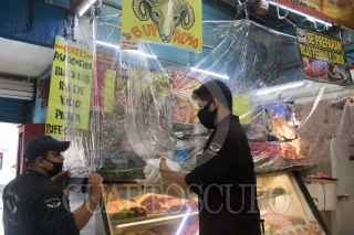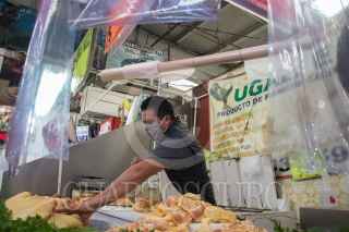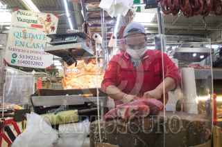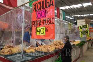 CIUDAD DE MÉXICO, 29JULIO2020.- En un mercado de la colonia Portales locatarios aplican las medidas sanitarias contra el Covid-19; como el uso de cubrebocas, caretas, gel antibacterial, aislamiento de sus locales con hule cristal o micas transparentes, esto con tal de brindarles a sus clientes la confianza para hacer sus compras. La colonia Portales Norte fue reclasificada a semáforo rojo por presentar una alza en los casos de Coronavirus estos últimos quince días. FOTO: MOISÉS PABLO/CUARTOSCURO.COM