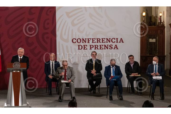 CIUDAD DE MÉXICO, 31JULIO2020.- Andrés Manuel López Obrador, presidente de México, acompañado de Jorge Alcocer Varela, secretario de Salud; Cristian Morales fuhrimann, representante de OPS/OMS en México; Fernando Cotrim Barbieri, representante de UNOPS; Juan Antonio Ferrer Aguilar, director general del Instituto de salud para el bienestar (Insabi); Marcelo Ebrard, secretario de Relaciones Exteriores y Julio Scherer Ibarra, consejero jurídico de Presidencia, durante la conferencia matutina en Palacio Nacional. FOTO: ANDREA MURCIA/CUARTOSCURO.COM