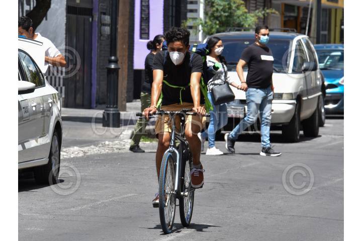 TOLUCA, ESTADO DE MÉXICO, 31JULIO2020.- Erick Alvarez junto con otro joven iniciaron el negocio de Albus bicimensajería, a raíz del gusto por el uso de la bicicleta, comenzaron a trabajar hace tres meses, en tiempos de COVID-19 cuando se incremento el uso de plataformas para poder pedir y llevar cualquier tipo de cosas, principalmente alimentos, la demanda aún es pequeña, llegan a hacer 5 viajes diarios, pero poco a poco han incrementado los servicios, sus principales clientes son negocios de comida aunque entregan cualquier cosas o hacen compras o algún otro mandado, entregan en todo el Valle de Toluca; el servicio se solicita a través de WhatsApp o sus redes sociales, se diferencian de otros servicios de entrega por el uso de bicicleta, y no cobran comisiones a los negocios, el precio depende de la distancia que tengan que recorrer para entregar los paquetes, teniendo una tarifa mínima de 30 pesos y saliendo de cierta zona son 3 pesos por kilómetro, buscan generar un impacto positivo tanto ambiental como económicamente. FOTO: CRISANTA ESPINOSA AGUILAR /CUARTOSCURO.COM