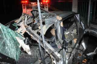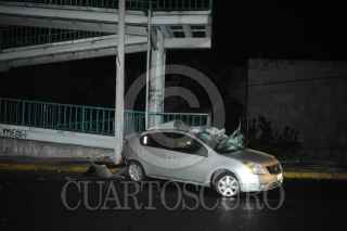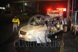 Cuautitlán Izcalli, Estado de México, 01 agosto 2020. Conductor de un auto muere al impactar con la base de concreto de puente peatonal, en carretera Tlalnepantla Cuautitlán, frente a la clínica 56 del IMSS en la colonia La Quebrada. El joven de aproximadamente 35 años viajaba semidesnudo, únicamente con una camisa, sin pantalón ni ropa interior. Foto: Luis Carbayo/cuartoscuro.com