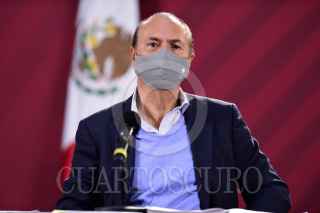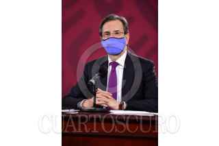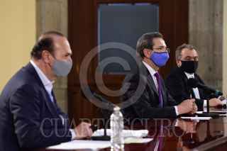 CIUDAD DE MÉXICO, 03AGOSTO2020.- Esteban Moctezuma Barragán, secretario de Educación Pública; Marcos Bucio Mújica, subsecretario de Educación Básica, y Enrique Quiroz Acosta, titular de la Unidad de Asuntos Jurídicos y Transparencia, durante las conferencias de la Educación en Palacio Nacional. FOTO: PRESIDENCIA/CUARTOSCURO.COM
