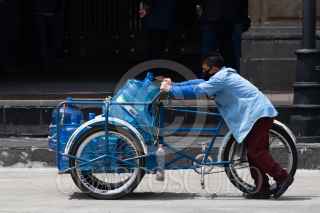 CIUDAD DE MÉXICO, 04AGOSTO2020.- Un hombre reparte agua embotelalda en un triciclo en las calles del Centro Histórico. FOTO: MOISÉS PABLO/CUARTOSCURO.COM