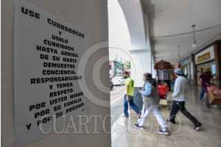 TOLUCA, ESTADO DE MÉXICO, 04AGOSTO2020.- En los Portales de Toluca colocaron letreros invitando a la población a utilizar de forma correcta el cubrebocas durante esta contingencia por COVID-19 y evitar aumente el número de contagios. FOTO: CRISANTA ESPINOSA AGUILAR /CUARTOSCURO.COM