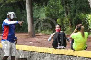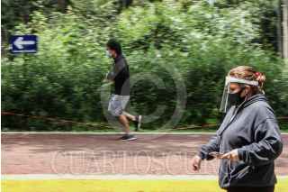 CIUDAD DE MEXICO, 04AGOSTO2020.- Con protocolos de uso de careta o cubrebocas obligatorios, el Bosque de Tlalpan ubicado al sur de la ciudad, se ha convertido en un lugar en el que cada ves más personas visitan para realizar actividades al aire libre. Así mismo dentro del lugar se prohíbe escupir o entra a las áreas de máquinas de ejercicio que se encuentran al centro de la pista. FOTO: ROGELIO MORALES /CUARTOSCURO.COM