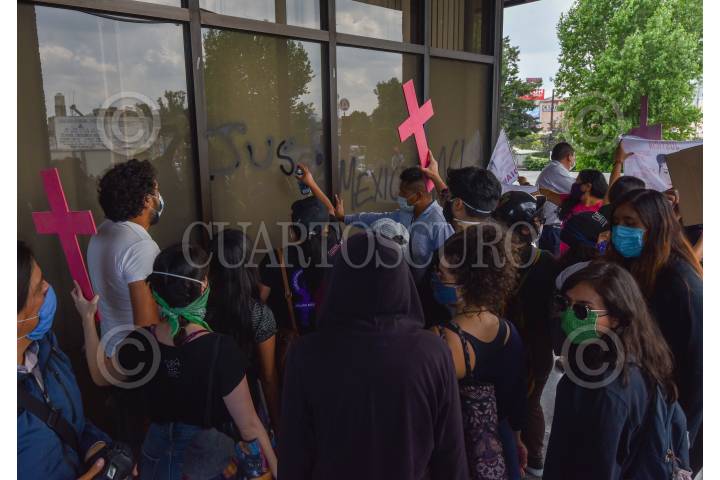 TOLUCA, ESTADO DE MÉXICO, 05AGOSTO2020.- Lidia Florencio mamá de Diana Velázquez Florencio y diversos colectivos feministas se manifestaron en las instalaciones de la Fiscalía General de Justicia del Estado de México (FGJEM) exigiendo justicia por el feminicidio de su hija, quien desapareció en el 2017 y acaba de cumplir 3 años de aparecer su cuerpo en el SEMEFO de Nezahualcóyotl, realizaron algunas pintas al edificio y a una patrulla estacionada en el lugar. FOTO: CRISANTA ESPINOSA AGUILAR /CUARTOSCURO.COM