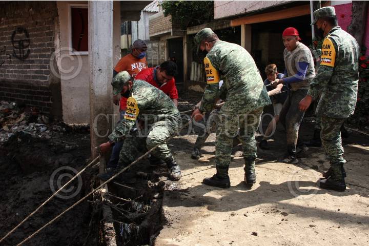 CIUDAD DE MEXICO, 05AGOSTO2020.- Elementos del ejército y la Guardia Nacional arribaron a la colonia San Mateo para realizar labores de limpieza y a poyo a vecinos de la alcaldía Xochimilco, esto tras del desbordamiento del río Santiago, el cual dejó severas afectaciones en viviendas y calles de dicha colonia. FOTO: ROGELIO MORALES /CUARTOSCURO.COM