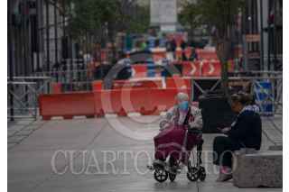 CIUDAD DE MÉXICO, 09AGOSTO2020.- Dos personas de tercera edad descansan en la calle Madero que se mantiene cerrada por la mañana para evitar aglomeraciones. FOTO: ANDREA MURCIA/CUARTOSCURO.COM