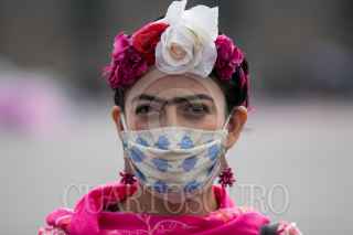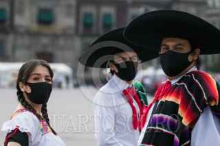 CIUDAD DE MÉXICO, 13AGOSTO2020.- Integrantes de la Secretaría de Turismo caracterizados como personajes folclóricos mexicanos recorren las calles del Centro Histórico para llamar a los transeúntes al uso correcto del cubrebocas para prevenir contagios de Covid-19. FOTO: GALO CAÑAS /CUARTOSCURO.COM