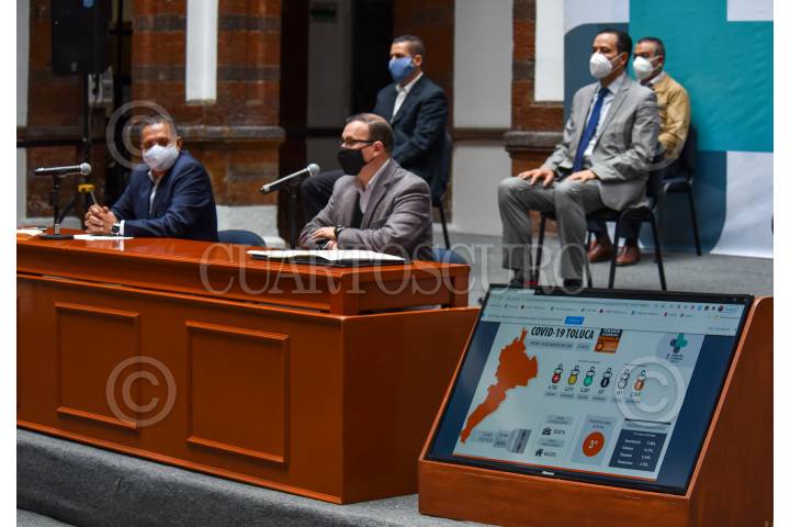 TOLUCA, ESTADO DE MEXICO, 13AGOSTO2020.- Ricardo Moreno, Secretario del Ayuntamiento de Toluca y Pedro Daniel García Muciño secretario técnico de la sala de Control COVID-19 informaron que hasta el momento se tienen 4 mil 754 casos positivos y 915 muertes por coronavirus, el uso obligatorio de cubrebocas ha dado resultados positivos pero se sigue invitando a la población a continuar con las medidas de prevención para evitar aumente el número de contagios. FOTO: CRISANTA ESPINOSA AGUILAR /CUARTOSCURO.COM