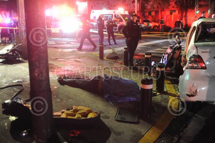 Ciudad de México, 18 agosto 2020. Fuerte choque entre un auto particular y un tráiler de doble remolque deja como saldo, dos personas sin vida y seis lesionados en el cruce de Eje Central Lázaro Cárdenas y Eje 6 Ángel Urraza en la colonia Independencia en alcaldía de Benito Juárez. El tráiler acabo impactado en dos predios que se consumieron en su totalidad luego de que el camión se incendió por el impacto. Foto: Luis Carbayo/cuartoscuro.com