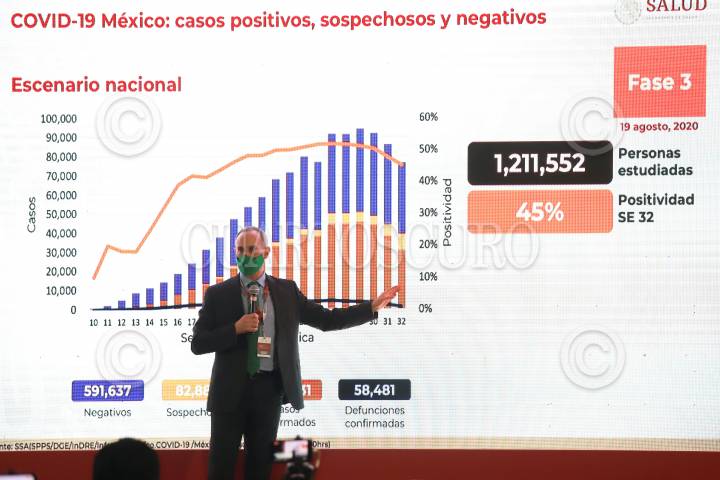 SAN LUIS POTOSÍ, SAN LUIS POTOSÍ, 19AGOSTO2020.- Juan Manuel Carreras López, gobernador de San Luis Potosí; Hugo López-Gatell Ramírez, subsecretario de Prevención y Promoción de la Salud, y Mónica Rangel Martínez, titular de Servicios de Salud en San Luis Potosí y secretaria técnica de la Comisión Consultiva de Salud Pública del Consejo Nacional de Salud (Conasa), durante el reporte diario del Covid-19. FOTO: PRESIDENCIA/CUARTOSCURO.COM