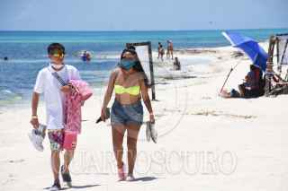 PLAYA DEL CARMEN, QUINTANA ROO, 20AGOSTO2020.- El Ayuntamiento de Solidaridad abrirá las playas de Playa del Carmen entre el 20 y el 30 de agosto como parte de un programa piloto para la reactivación turística de la ciudad. Para poder ingresar a las mismas, los ciudadanos deben tener en cuenta 8 requisitos indispensables para mantener a raya el Covid y que esta iniciativa arroje óptimos resultados. Con esta medida, Playa del Carmen se convierte en el primer municipio en poner a prueba un plan piloto para la reapertura de playas, luego de que fueron cerradas al público a principios de abril por la pandemia. Tras los 10 días de reapertura se evaluarán los resultados para determinar si continuarán no abiertas. Las playas abiertas son punta esmeralda, playa 88 y Xcalacoco. FOTO: ELIZABETH RUIZ/CUARTOSCURO.COM