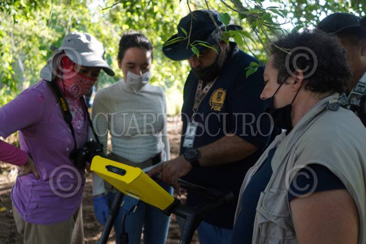 COAHUAYANA, MICHOACÁN, 20AGOSTO2020. En el primer día de búsqueda por la sierra-costa de Michoacán, se ubicó una fosa clandestina en la que se localizó una falange, hueso de una mano, motivo por el que la exploración quedó totalmente en manos de la Fiscalía General del Estado de Michoacán y de su Comisión de Búsqueda de Desaparecidos, quienes reservaron la información de hallazgos hasta terminar la investigación. La búsqueda está realizándose en un predio de la costa de Coahuayana, donde están presentes las autoridades por conducto de la propia Comisión Nacional de Búsqueda de Personas Desaparecidas, la Fiscalía General de la República, la Fiscalía General del Estado de Michoacán, la Guardia Nacional, la Secretaría de la Defensa Nacional, la Policía Michoacán, la Policía Michoacán Ambiental y otras corporaciones de seguridad, así como colectivos civiles que apoyan a familiares a localizar a desaparecidos. FOTO: JUAN JOSÉ ESTRADA SERAFÍN/CUARTOSCURO.COM