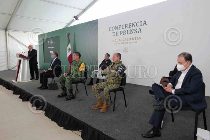 AGUASCALIENTES, AGUASCALIENTES, 21AGOSTO2020.- Andrés Manuel López Obrador, Presidente de México en conferencia de prensa. Acompañan al mandatario: Martín Orozco Sandoval, gobernador de Aguascalientes; Luis Cresencio Sandoval González, secretario de la Defensa Nacional; José Rafael Ojeda Durán, secretario de Marina; Alfonso Durazo Montaño, secretario de Seguridad y Protección Ciudadana; Luis Rodríguez Bucio, comandante de la Guardia Nacional y María Teresa Jiménez Esquivel, presidenta municipal de Aguascalientes. FOTO: PRESIDENCIA/CUARTOSCURO.COM