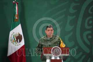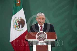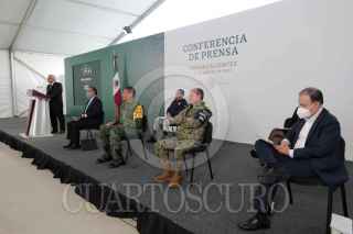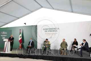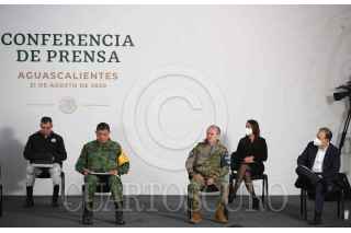 AGUASCALIENTES, AGUASCALIENTES, 21AGOSTO2020.- Andrés Manuel López Obrador, Presidente de México en conferencia de prensa. Acompañan al mandatario: Martín Orozco Sandoval, gobernador de Aguascalientes; Luis Cresencio Sandoval González, secretario de la Defensa Nacional; José Rafael Ojeda Durán, secretario de Marina; Alfonso Durazo Montaño, secretario de Seguridad y Protección Ciudadana; Luis Rodríguez Bucio, comandante de la Guardia Nacional y María Teresa Jiménez Esquivel, presidenta municipal de Aguascalientes. FOTO: PRESIDENCIA/CUARTOSCURO.COM