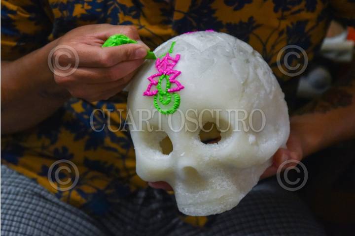 TOLUCA, ESTADO DE MÉXICO, 21AGOSTO2020.- Brandon Rodríguez y su familia se han dedicado por varias generaciones a la elaboración del alfeñique, él a sus 26 años de edad se dedica más al decorado del azúcar y trata de innovar en la decoración de las calaveras cada año, utilizando formas geométricas combinación de colores, adornar sin dejar espacios. Este año ha sido complicado no solo para él y su familia si no para todos los artesanos que se dedican al alfeñique, su producción inicia regularmente después de Semana Santa pero al iniciar la contingencia por COVID-19 decidieron esperar ante la incertidumbre de lo que podría suceder; faltan dos meses para la celebración del Día de Muertos, las autoridades municipales anunciaron en días pasados que la celebración de la Feria del Alfeñique que se instala cada año en los Portales de Toluca sufriría cambios ya que no se pueden dar concentraciones masivas, se planea instalar algunos kioskos en diversos puntos de la ciudad para que los artesanos puedan vender sus dulces; algunos tiene ya producción como Brandon, que buscara vender entre conocidos y se apoyarán en las redes sociales, en cambio otros artesanos decidieron definitivamente no producir nada para no perder su inversión. FOTO: CRISANTA ESPINOSA AGUILAR /CUARTOSCURO.COM