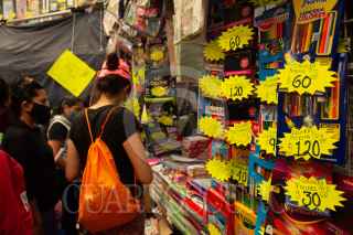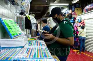 CIUDAD DE MÉXICO, 21AGOSTO2020.- El próximo lunes los niños de todo el país regresarán a clases, pero este ciclo escolar será impartido a través de la televisión, distintos canales firmaron un acuerdo con el Gobierno Federal para poder transmitir las clases en los niveles de primaria y secundaria, mientras llega ese día, los padres asisten a la Plaza de Mesones para completar la lista de útiles escolares. FOTO: DANIEL AUGUSTO/CUARTOSCURO.COM