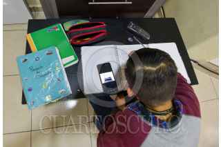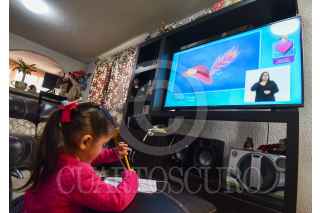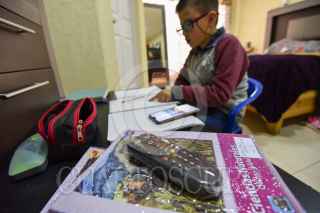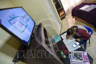 TOLUCA, ESTADO DE MÉXICO, 24AGOSTO2020.- El inicio del ciclo escolar 2020-2021 es diferente por la pandemia de COVID-19, desde muy temprana hora comenzaron las clases de ma era virtual, los estudiantes se sentaron frente a la televisión para poder iniciar sus actividades, teniendo al lado todos sus materiales como libretas, lápices, libros, celular y control remoto; su mamá revisa el trabajo de sus dos hijos para poder mandar las evidencias a sus profesoras, y más tarde se tendrá sesión por internet para aclarar dudas. FOTO: CRISANTA ESPINOSA AGUILAR /CUARTOSCURO.COM