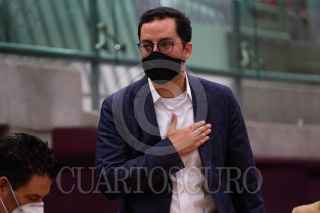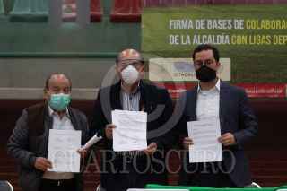 CIUDAD DE MÉXICO, 25AGOSTO2020.- Alejandro Valle, presidente de la Liga Inter Semanal de Fútbol Rápido Coyuya AC; Armando Quintero, alcalde Iztacalco, y Rodrigo Dosal Ulloa, director del Instituto del Deporte de la Ciudad de México, durante la firma de colaboración entre la alcaldía y las ligas deportivas amateurs para que puedan regresar a la actividad siguiendo los protocolos sanitarios que indica el semáforo naranja de la pandemia de Covid-19. FOTO: MOISÉS PABLO/CUARTOSCURO.COM
