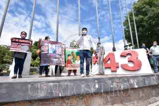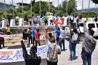 CHILPANCINGO, GUERRERO, 26AGOSTO2020.- Estudiantes de la Escuela Normal Rural Raúl Isidro Burgos de Ayotzinapa, acompañados de integrantes del colectivo 'Los Olvidados de Ayotzinapa" y de diversas organizaciones sociales, conmemoraron con un mitin político los 71 meses de la desaparición forzada de 43 y asesinato de otros 3 de sus compañeros en la ciudad de Iguala en el año 2014. Señalaron que es lamentable que el gobierno federal otorgara al ex presidente de Iguala José Luis Abarca y a su esposa maría de los Ángeles Pineda Villa, a quienes acusan de ser los responsables de estos hechos. Asegurando que, con esto, se abre la posibilidad de que pudieran lograr ser liberados. También reprocharon al presidente Andrés Manuel López Obrador quien se comprometió a resolver este caso y dar una respuesta satisfactoria sobre el paradero de los estudiantes, sin embargo, hasta el momento sólo se han tendido cortinas de humo. FOTO: DASSAEV TÉLLEZ ADAME/CUARTOSCURO.COM