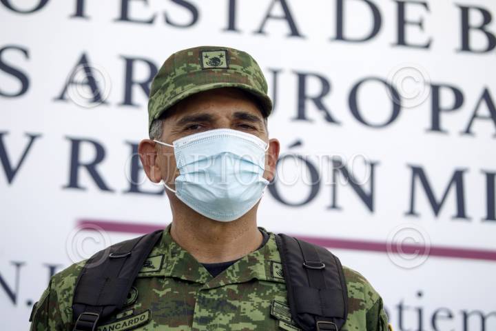 APODACA, NUEVO LEÓN, 01SEPTIEMBRE2020.- Dentro de las instalaciones del VII Zona Mlitar, se llevó a cabo la toma de posesión y protesta de bandera al General de Brigada D.E.M. Carlos Arturo Pancardo Escudero Comandante de la IV Región Militar, la cual incluye los estados de Nuevo León, Tamaulipas y San Luis Potosí. FOTO: GABRIELA PÉREZ MONTIEL / CUARTOSCURO.COM