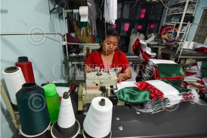 TOLUCA, ESTADO DE MÉXICO, 02SEPTIEMBRE2020.- Talleres de banderas de México en San Pedro Totoltepec en Toluca se han visto afectados por la contingencia por COVID-19; Rafael Cosme se dedica a la elaboración de banderas de Mexico desde hace más de 30 años, pero este año la producción bajo al menos un 70 por ciento, de 15 costureras que trabajan en su taller hoy en día solo tiene 2, su producto no solo se vendía en el territorio mexicano si no también en lugares como Estados Unidos, pero a raíz de la pandemia de COVID-19 sus ventas han caído drásticamente, otro factor que ha mermado sus ventas es la entrada de banderas de origen chino las cuales son de muy mala calidad y bajo precio; los festejos de las fiestas patrias este año cambiarán drásticamente pero los productores de banderas piden a la población comprar sus banderas y colocarlas en sus casas como una forma de celebrar con seguridad y apoyando a los productores mexicanos. FOTO: CRISANTA ESPINOSA AGUILAR /CUARTOSCURO.COM