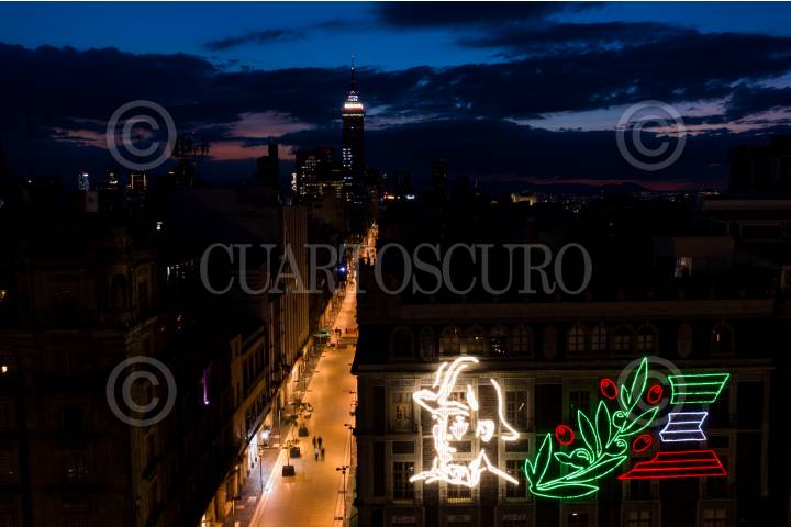 CIUDAD DE MÉXICO, 02SEPTIEMBRE2020.- Desde el día de ayer, la tradicional luminaria con motivo a las fiestas patrias, que adorno los edificios del Zócalo capitalino, será encendida cada noche. Este año se conmemora 210 años del inicio de la Independencia de México sin embargo debido a la pandemia por Covid-19 el grito sólo contará con la presencia de 500 personas en la plancha a fin de mantener la sana distancia y evitar las aglomeraciones masivas, así lo señaló el presidente Andrés Manuel López Obrador. FOTO: GALO CAÑAS /CUARTOSCURO.COM