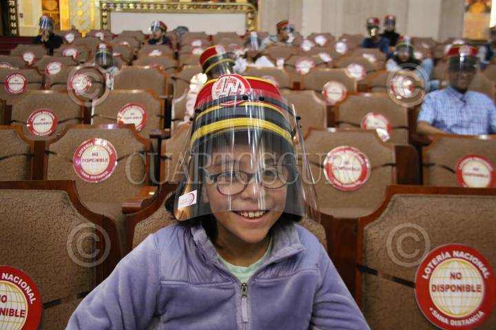 CIUDAD DE MÉXICO, 03SEPTIEMBRE2020.- En la Lotería Nacional se encuentran en plenos preparativos para el Gran Sorteo del Avión Presidencial, aunque el Jefe del Ejecutivo ya ha aclarado que en realidad serán cien premios de 20, 000, 000 millones de pesos, los billetes llevan la imagen del TP-01 "José María Morelos y Pavón". Los llamados niño gritones se encuentran en plenos ensayos para el sorteo que se realizará el 15 de septiembre a las 16:00 hrs en el Edificio El Moro, señalan que se sienten emocionados por que para ellos es un hecho histórico, y a decir por autoridades de la Lotenal en muchos sentidos es único ya que jamás se había hecho uno con estas características. Los pequeños realizan todo el protocolo que habrá de durar cerca de 3 horas con las medidas sanitarias para protegerse del Covid-19. FOTO: MOISÉS PABLO/CUARTOSCURO.COM