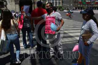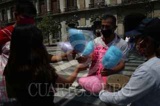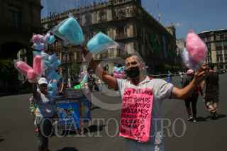CIUDAD DE MÉXICO, 03SEPTIEMBRE2020.- Un grupo de ferieros pidieron el apoyo económico de las personas que transitaban en el Zócalo a cambio de ello regalaban algodones de azúcar, y es que a decir de ellos el giro de la ferias está en una grave crisis económica ya que tuvieron que parar cerca de 5 meses por la pandemia de Covid-19 y actualmente aún no tienen luz verde de las autoridades sanitarias para poder reiniciar actividades. FOTO: MOISÉS PABLO/CUARTOSCURO.COM