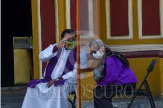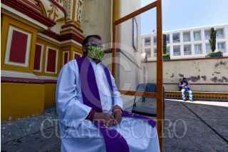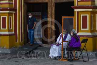 TOLUCA, ESTADO DE MÉXICO, 03SEPTIEMBRE2020.- Las confesiones en la iglesia de la Santa Veracruz se llevan a cabo a las afueras de la iglesia y con una barrera protectora como parte de las medidas sanitarias ante la contingencia por COVID-19. FOTO: CRISANTA ESPINOSA AGUILAR /CUARTOSCURO.COM
