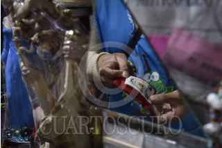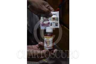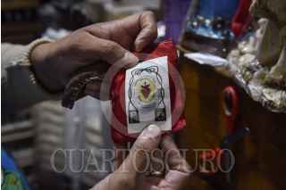 CIUDAD DE MÉXICO, 05SEPTIEMBRE2020.- Irma trabajadora del mercado de Sonora lleva a cabo la venta de amuletos "Detente enemigo" que se vende bajo un pedido previo. El "kit" consta de un aceite con la imagen de Andrés Manuel López Obrador, una imagen de "Detente, el corazón de Jesús", una imagen de Jesús y un amuleto. FOTO: MARIO JASSO /CUARTOSCURO.COM