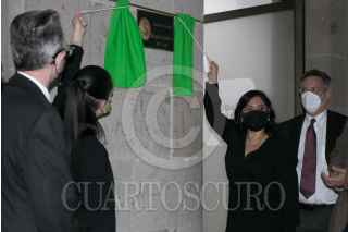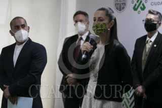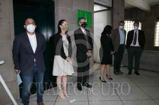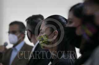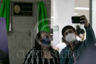 CIUDAD DE MÉXICO, 08SEPTIEMBRE2020.- La jefa de gobierno de la Ciudad de México, Claudia Sheinbaum, en compañía del secretario de Gobierno Alfonso Suárez del Real e Irma Erendira Sandoval, secretaria de la Función Pública, así como familiares del periodista Virgilio Caballero (1942-2019) develaron la placa de la Sala de Prensa que llevara el nombre del periodista tamaulipeco. FOTO: GALO CAÑAS /CUARTOSCURO.COM