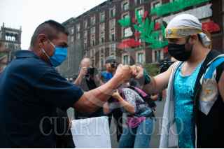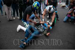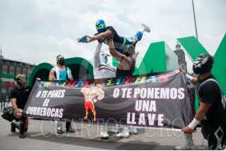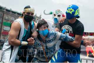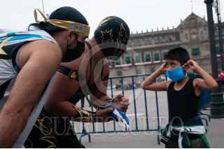 CIUDAD DE MÉXICO, 10SEPTIEMBRE2020.- Distintos luchadores pertenecientes a la organización "Chinampaluchas" asistieron al Zócalo de la capital para repartir cubrebocas a los transeúntes que no portaran uno, en caso de no colocárselo, los atletas lo someterían mediante una llave en manera de broma para ponérselo, esta campaña que realizan en distintas alcaldías es con el objetivo de concientizar a las personas y evitar la propagación y contagios de Covid-19 entre los habitantes de la Ciudad. FOTO: DANIEL AUGUSTO/CUARTOSCURO.COM