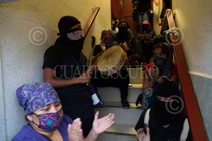 ECATEPEC, ESTADO DE MÉXICO, 10SEPTIEMBRE2020. - Colectivas feministas y familiares de víctimas, tomaron las instalaciones de la Comisión Nacional de Derechos Humanos del Estado de México (CODHEM). Al pedir el seguimiento de sus casos se les atendió vía telefónica pidiendo que se realizara trámite formal a través de la página web, lo que provocó molestia decidiendo quedarse hasta no resolver sus denuncias. FOTO: ANDREA MURCIA /CUARTOSCURO.COM