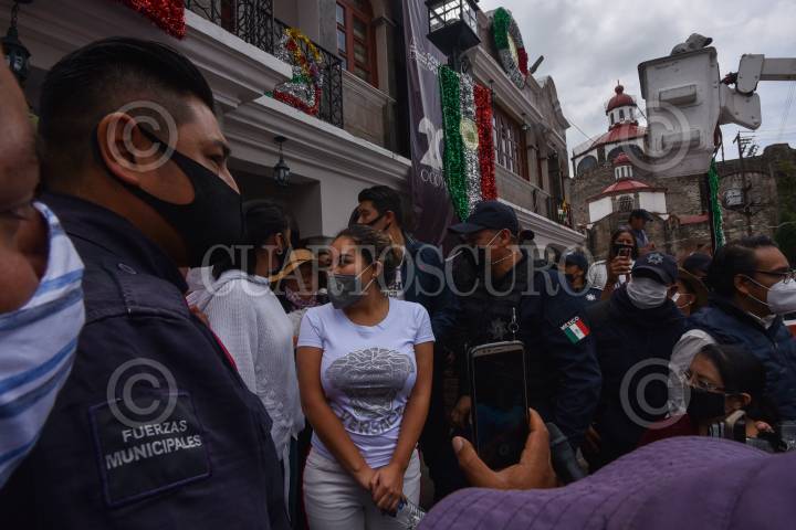 OCOYOACAC, ESTADO DE MÉXICO, 11SEPTIEMBRE2020.- Pobladores de Ocoyoacac acorralaron a la alcaldesa Anallely Olivares, al solicitar una audiencia con ella para discutir temas de seguridad del municipio y la encontraron en un salón de bellezaa media cuadra del palacio municipal, en donde de acuerdo a los vecinos se estaba arreglando las uñas, estuvo retenida por algunos minutos hasta que comenzaron a dialogar en la plaza municipal. FOTO: CRISANTA ESPINOSA AGUILAR /CUARTOSCURO.COM