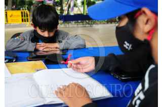 CIUDAD DE MÉXICO, 11SEPTIEMBRE2020.- En el parque Fortino Serrano, en la Alcaldía Venustiano Carranza, se ofrece servicio de internet y dispositivos digitales para que los jóvenes que no tienen acceso a esta tecnología puedan asistir a este punto habilitado por las autoridades de la demarcación para facilitar el regreso a clases que ahora se cursa de forma remota por medio de la televisión, radio e internet debido a la pandemia de Covid-19. FOTO:DANIEL AUGUSTO/CUARTOSCURO.COM