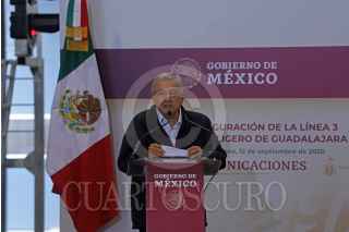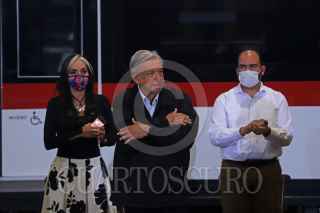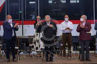 TONALÁ, JALISCO, 12SEPTIEMBRE2020.- Andrés Manuel López Obrador Presidente de México y Enrique Alfaro Ramírez Gobernador del Estado, encabezaron la inauguración de la Línea 3 del Tren Ligero, luego de seis años del inicio de los trabajos de construcción, el evento tuvo lugar en el patio de maniobras de la Línea 3 del Tren Ligero de Guadalajara. Al lugar también acudieron algunos colectivos de familiares de personas desaparecidas así como otros en pro y en contra del mandatario federal. FOTO: FERNANDO CARRANZA GARCIA / CUARTOSCURO.COM