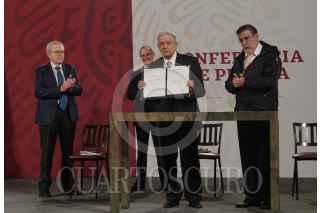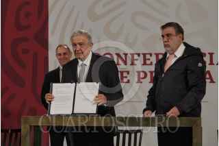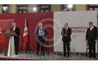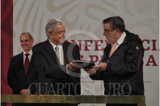 CIUDAD DE MÉXICO, 15SEPTIEMBRE2020. - Andrés Manuel López Obrador, presidente de México, acompañado de Jorge Alcocer Varela, secretario de Salud; Hugo López-Gatell Ramírez, subsecretario de Prevención y Promoción de la Salud y Julio Scherer Ibarra, consejero jurídico de la Presidencia durante la conferencia matutina que se lleva a cabo en Palacio Nacional Prevención y Promoción de la Salud y Julio Scherer Ibarra, consejero jurídico de la Presidencia, durante la conferencia de prensa que se lleva a cabo en Palacio Naciona en la cual se firmó documento solicitud para el senado de la República donde se pide enjuiciar a ex presidentes desde el año 1988. FOTO: ANDREA MURCIA /CUARTOSCURO.COM