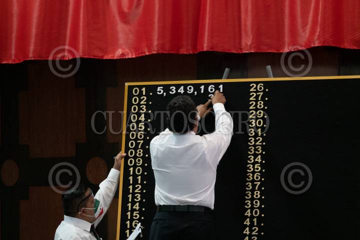 CIUDAD DE MÉXICO, 15SEPTIEMBRE2020. - Ernesto Prieto Ortega, director general de la Lotería Nacional y asistencia Pública; Olga Sánchez Cordero, secretaria de Gobernación y Jorge Mendoza Sánchez, director General Banobras, encabezaron el Sorteo del avión presidencial que se llevó a cabo en el edificio de la Lotería Nacional. El primer boleto premiado perteneció a la numeración 5,349,161. FOTO: ANDREA MURCIA