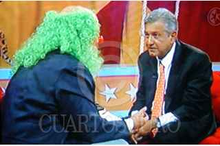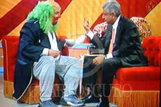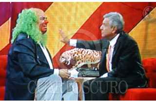 México D.F., a 15 de Mayo de 2006.- Brozo, en su programa nocturno de todos los viernes, tuvo como invitado al aspirante presidencia de la Calición por el Bien de Todos Andrés Manuel López Obrador. El candidato chacoteo y converso con el payaso tenebroso, por mas de una hora, en el programa que se transmite por el canal de las estrellas. FOTO: Tomada de la televisión/CUARTOSCURO.COM