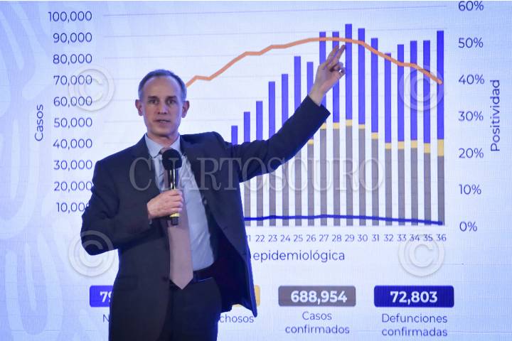 CIUDAD DE MÉXICO, 18SEPTIEMBRE2020.- Hugo López-Gatell Ramírez, Subsecretario de Prevención y Promoción de la Salud; Donato Casas, secretario de Salud de Oaxaca y Alethse de la Torre, directora general del Centro Nacional para la Prevención y Control del VIH/SIDA, durante conferencia de prensa para informar sobre la actualización de datos de la pandemia de coronavirus (covid-19) en el país. El informe diario indicó 688 mil 954 casos confirmados acumulados, y 73 mil 803 defunciones. FOTO: MARIO JASSO /CUARTOSCURO.COM