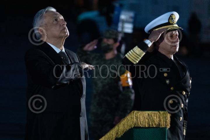 CIUDAD DE MÉXICO, 19SEPTIEMBRE2020.- En conmemoración a las víctimas del sismo del 19 de septiembre del 2017, Andrés Manuel López Obrador, presidente de México acompañado por su gabinete, encabezaron izamiento de bandera en la plancha del Zócalo Capitalino a las 7:19 am como desde hace tres años. FOTO: ANDREA MURCIA/CUARTOSCURO.COM
