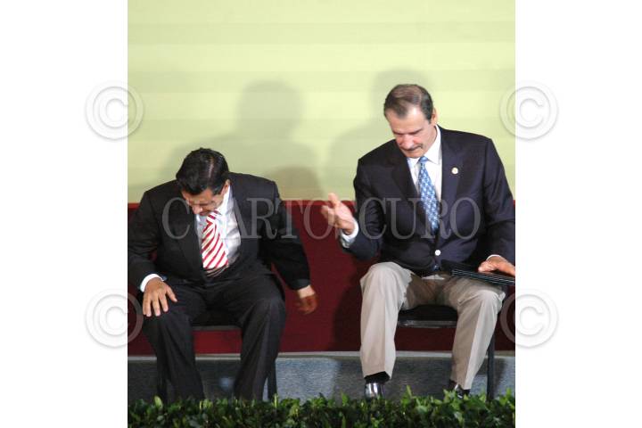 METEPEC, ESTADO DE MÉXICO, 15MAYO2006.- Vicente Fox Quesada, primer mandatario mexicano, Marta Sahagún de Fox, Enrique Peña Nieto, gobernador del Estado, Mónica Pretelini, esposa del gobernador del Estado y Elba Esther Gordillo Morales, líder del Sindicato Nacional de Trabajadores de la Educación (SNTE) y durante la ceremonia conmemorativa del día del maestro realizada en el Centro Cultural Mexiquense. FOTO: Iván Stephens/CUARTOSCURO.COM