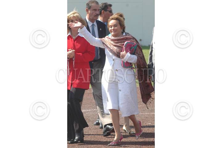 METEPEC, ESTADO DE MÉXICO, 15MAYO2006.- Vicente Fox Quesada, primer mandatario mexicano, Marta Sahagún de Fox, Enrique Peña Nieto, gobernador del Estado, Mónica Pretelini, esposa del gobernador del Estado y Elba Esther Gordillo Morales, líder del Sindicato Nacional de Trabajadores de la Educación (SNTE) y durante la ceremonia conmemorativa del día del maestro realizada en el Centro Cultural Mexiquense. FOTO: Iván Stephens/CUARTOSCURO.COM