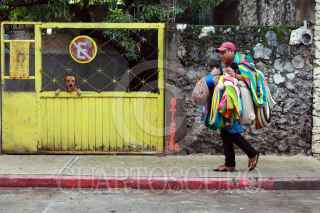 JOJUTLA, MORELOS,20SEPTIEMBRE2020.- Un hombre que vende hamacas de muchos colores camina frente a una vivienda que es custodiada por un perro. FOTO: MARGARITO PÉREZ RETANA /CUARTOSCURO.COM