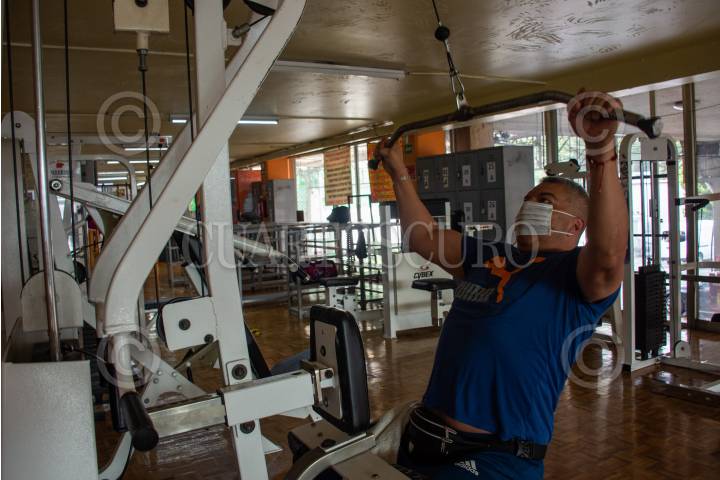 CIUDAD DE MÉXICO, 21SEPTIEMBRE2020.- Gimnasios de la capital del país vuelven a abrir sus puertas luego de permanecer cerrados más de seis meses debido a la pandemia de Covid-19, para volver a operar, estos negocios deberán cumplir con las normas establecidas por las autoridades sanitarias y del gobierno local como el uso del gel antibacterial y cubrebocas por parte de sus usuarios, el aforo no deberá superar el 30%, sólo se podrá permanecer una hora dentro del establecimiento, generar un sistema de citas para poder asistir al gimnasio y no se podrán dar clases grupales. De a cuerdo con la Asociación Mexicana de Gimnasios y Clubes (Amegyc) los negocios de este rubro registraron pérdidas mensuales de 2 mil millones de pesos. FOTO: DANIEL AUGUSTO/CUARTOSCURO.COM