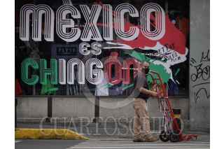 CIUDAD DE MÉXICO, 25SEPTIEMBRE2020. - Un hombre lleva diablito por las calles del Centro Histórico de la Ciudad pasando por un aparador haciendo énfasis en las fiestas patrias. FOTO: ANDREA MURCIA /CUARTOSCURO.COM