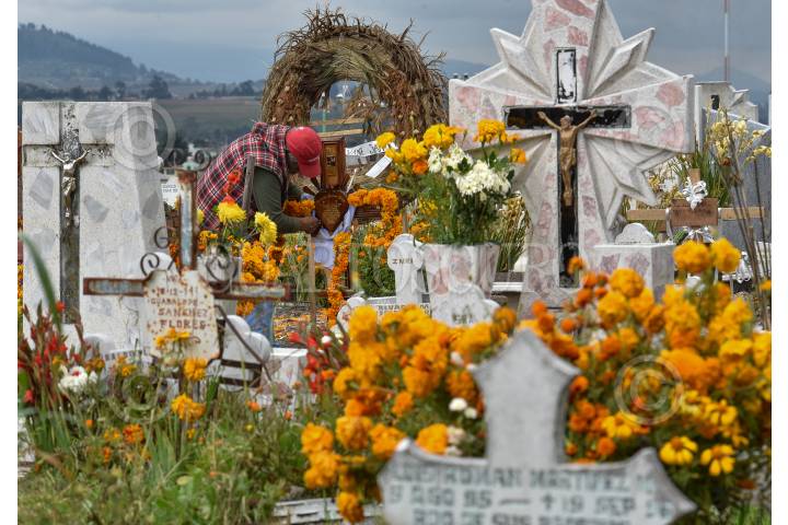 TOLUCA, ESTADO DE MÉXICO, 29SEPTIEMBRE2020.- Los panteones de la zona indígena de Toluca fueron abiertos para que la población pudiera acudir a arreglar las tumbas de sus muertos con flor se cempasúchil como parte de los festejos a San Miguel Arcángel y previo a la celebración del Día de Muertos, este año la festividad sufrió cambios ya que no se deja ingresar a tantas personas al mismo tiempo al lugar y muchos de los muertos son de recientes fechas, algunos por COVID-19; el color naranja predomina en el panteón por los pétalos y flores que adornan cada tumba, en su mayoría son personas que van solas a visitar los sepulcros, el resto de la familia permanece en casa por la contingencia de Coronavirus. FOTO: CRISANTA ESPINOSA AGUILAR /CUARTOSCURO.COM