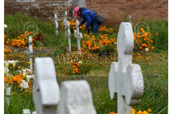TOLUCA, ESTADO DE MÉXICO, 29SEPTIEMBRE2020.- Los panteones de la zona indígena de Toluca fueron abiertos para que la población pudiera acudir a arreglar las tumbas de sus muertos con flor se cempasúchil como parte de los festejos a San Miguel Arcángel y previo a la celebración del Día de Muertos, este año la festividad sufrió cambios ya que no se deja ingresar a tantas personas al mismo tiempo al lugar y muchos de los muertos son de recientes fechas, algunos por COVID-19; el color naranja predomina en el panteón por los pétalos y flores que adornan cada tumba, en su mayoría son personas que van solas a visitar los sepulcros, el resto de la familia permanece en casa por la contingencia de Coronavirus. FOTO: CRISANTA ESPINOSA AGUILAR /CUARTOSCURO.COM