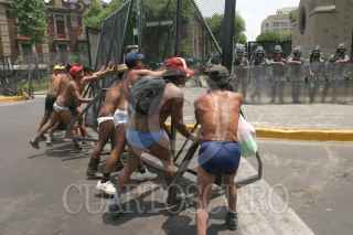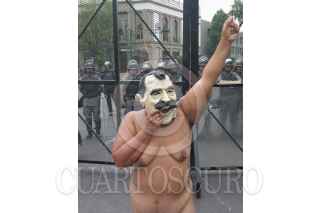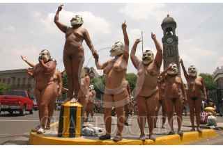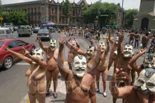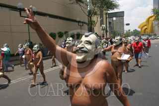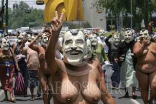 MEXICO, D.f., 16MAYO2006.- La organización campesina de los 400 Pueblos, marcharon del Monumento de Cuauhtemoc a la Secretaría de Gobernación, exigiendo se cumplan los acuerdos que supuestamente firmaron con el gobierno. Los manifestantes que se caracterizan por ir desnudas estaban iban enmascaradas del Presidente de la República. FOTO: Moisés Pablo/CUARTOSCURO.COM